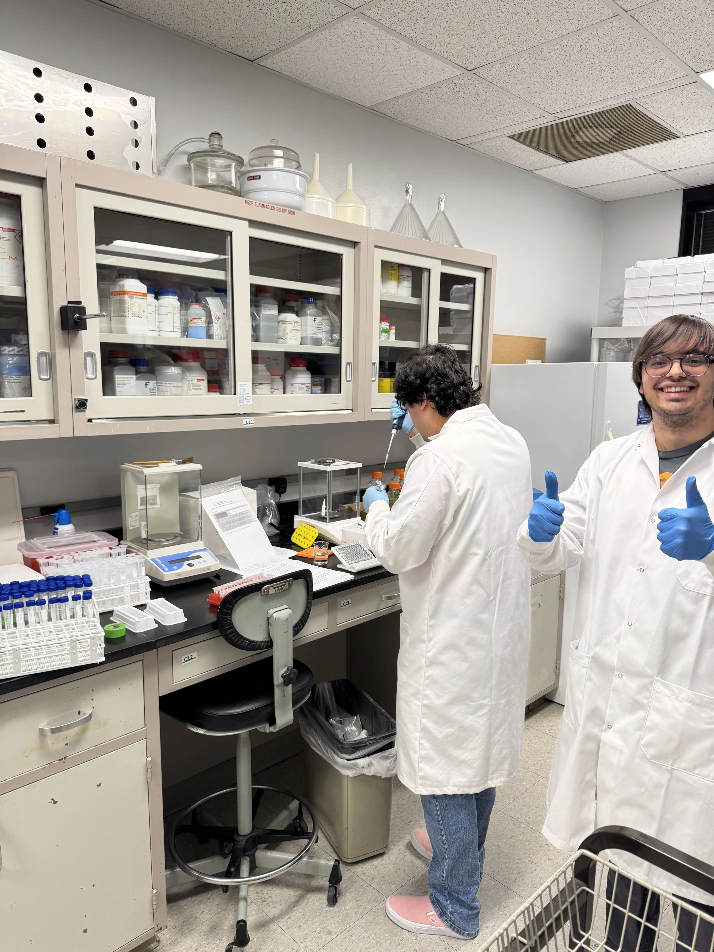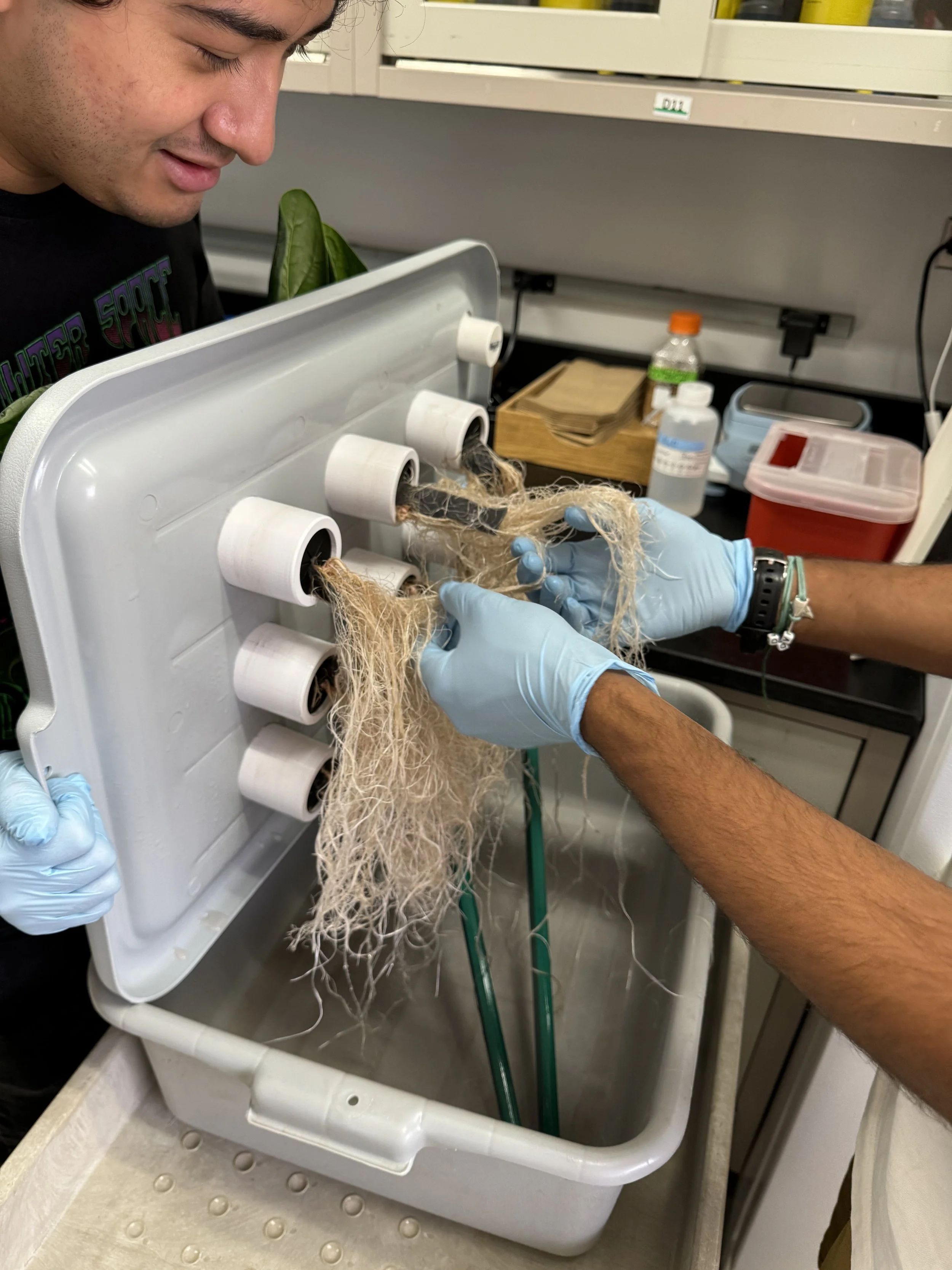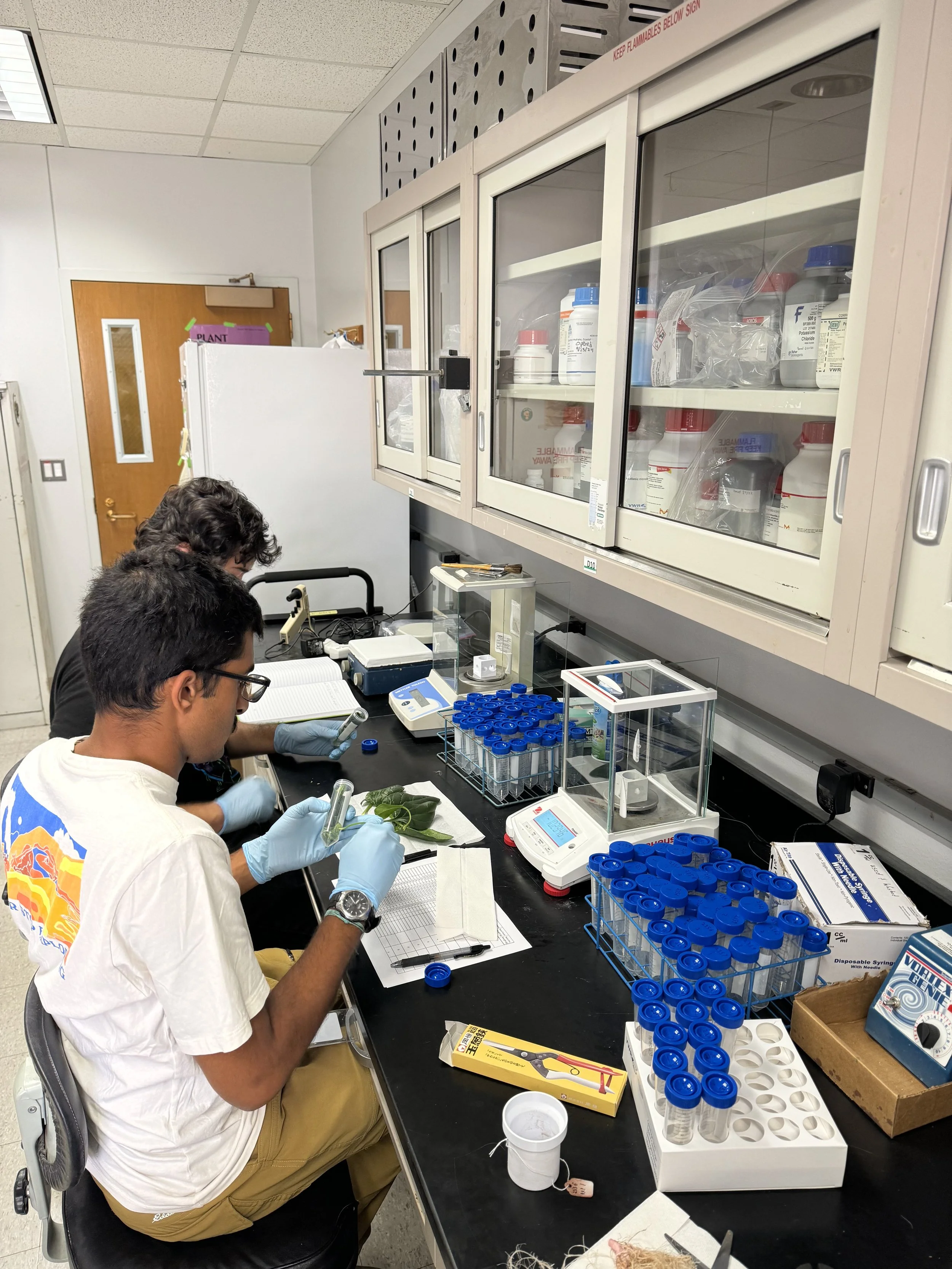 Alex and Suraj teaming up to harvest experimental material (October, 2024)